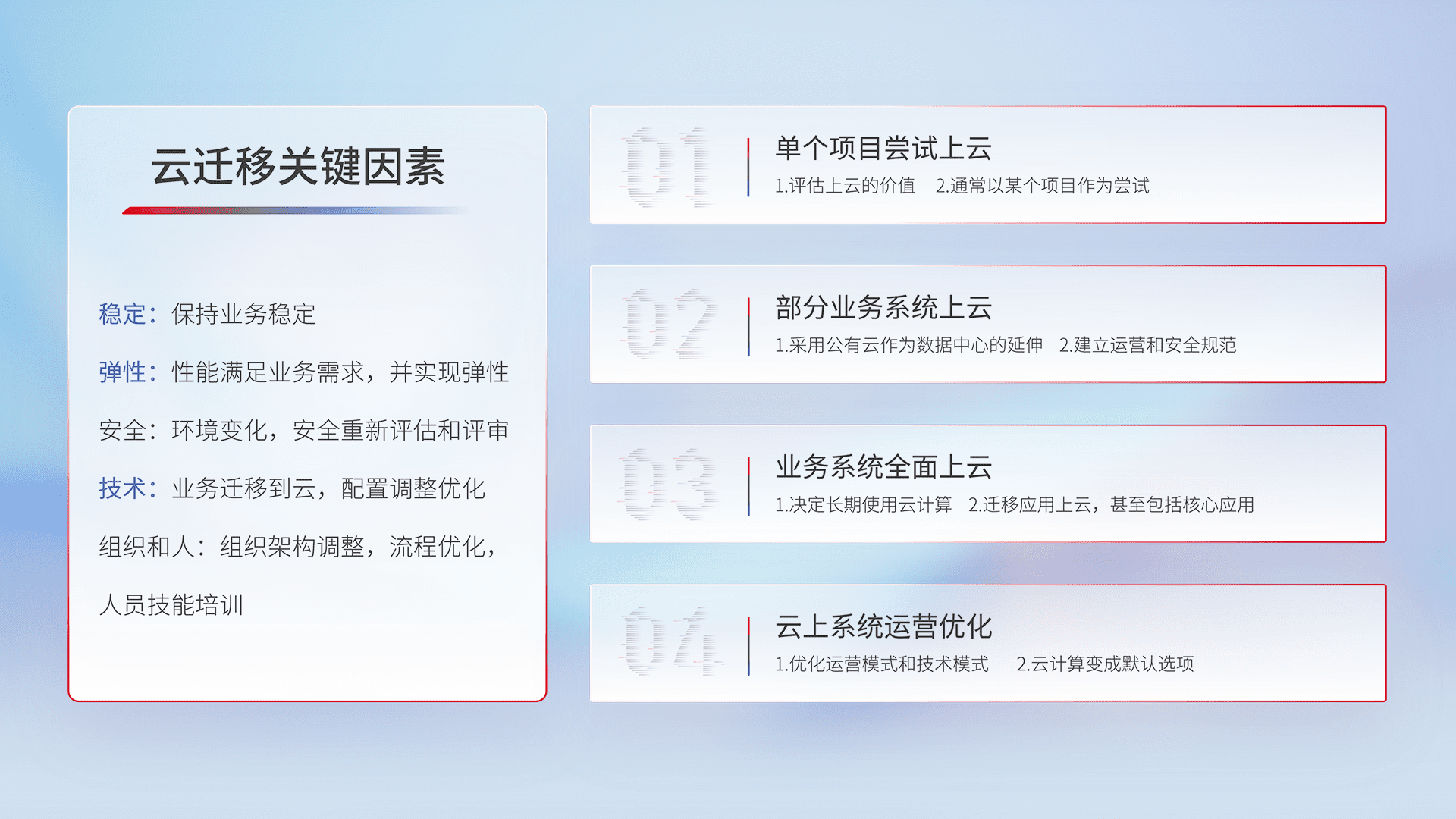 结合实际业务,,从规划设计、、云平台选型、、云原生改造、、数据迁移、、集成交付,,迁移全过程为客户识别最佳上云路径,,,做好风险识别管理,,设计网络架构、、、身份权限、、、、安全审计合规、、、、操作审计、、、、日志审计、、、监控告警策略、、、多站点容灾设计等,,,,对云上基础设施进行整体规划,,,提升IT治理水平,,,,以满足弹性、、高可用、、、、高性能的需求。。