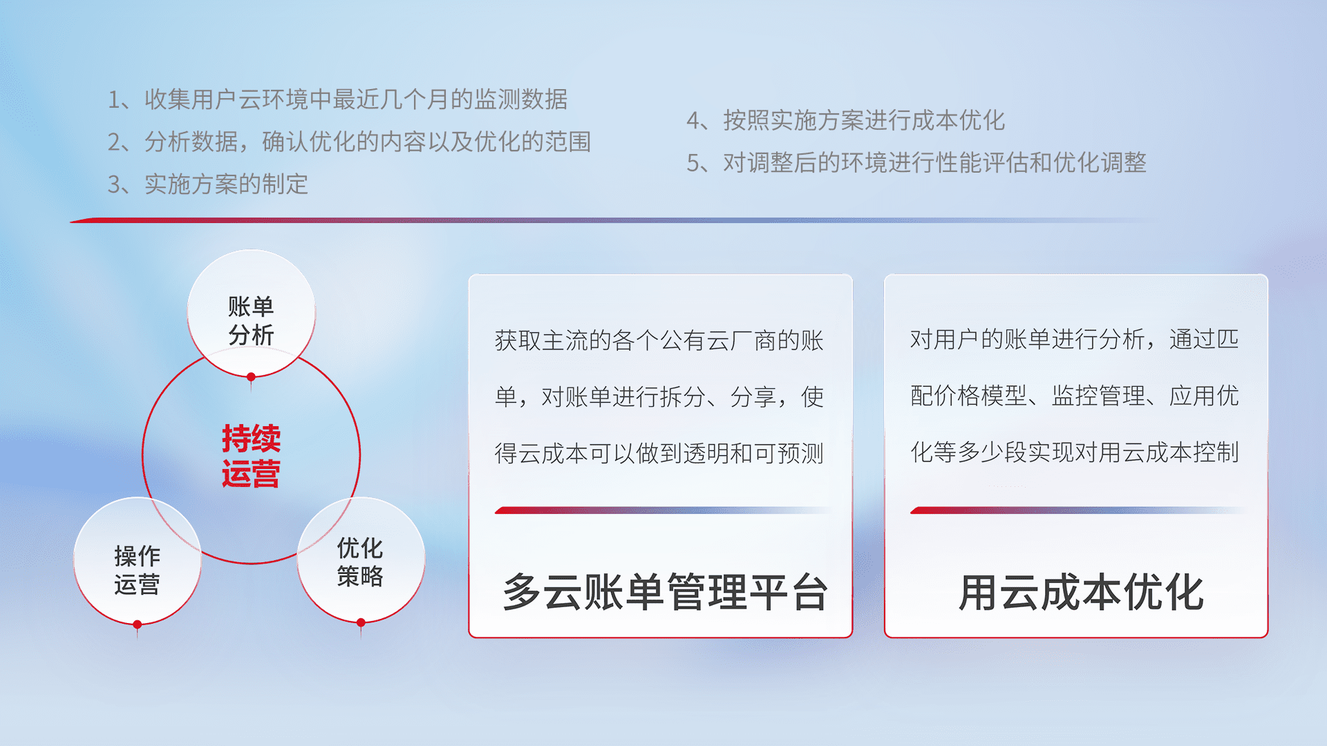 通过多云纳管,,,以统一的资源数据模型把客户的云资源进行抽象和封装,,进而实现对多云资源的统一操作,,保障云资源管理的可靠性、、、、稳定性与可用性。。量身定制化运维内容,,配置、、、、开发运维、、、补丁管理、、、备份、、、、监控、、、、认证和访问管理、、审计和日常巡检等,,,,保障在用云过程中的可靠度,,,,稳定度以及高可用率。。